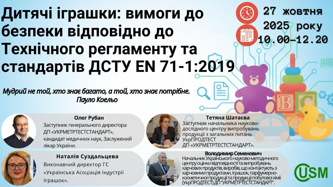 Навчання Дитячі іграшки: вимоги до безпеки відповідно до Технічного регламенту та стандартів ДСТУ EN 71-1:2019 ШАНОВНІ КОЛЕГИ ! ДП «УКРМЕТРТЕСТСТАНДАРТ» проводить вебінар на тему: Дитячі іграшки: вимоги до безпеки відповідно до Технічного регламенту та стандартів ДСТУ EN 71-1:2019 Дата: 27 жовтня 2025 року Час: 10.00-12.20 Формат: онлайн на платформі ZOOM Read more »