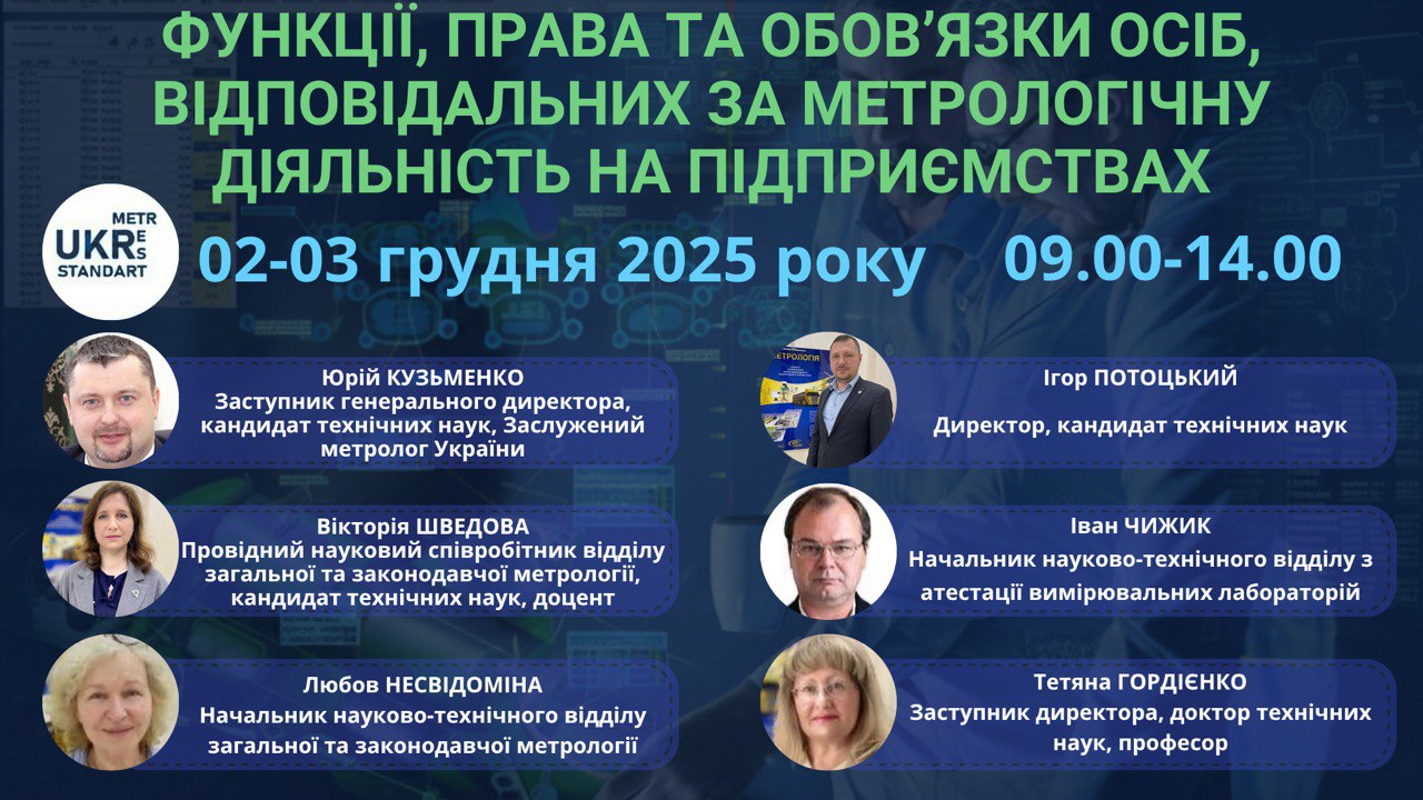 Навчання ФУНКЦІЇ, ПРАВА ТА ОБОВ’ЯЗКИ ОСІБ, ВІДПОВІДАЛЬНИХ ЗА МЕТРОЛОГІЧНУ ДІЯЛЬНІСТЬ НА ПІДПРИЄМСТВАХ ШАНОВНІ КОЛЕГИ! Державне підприємство «УКРМЕТРТЕСТСТАНДАРТ» проводитьнавчальний семінар за темою: ФУНКЦІЇ, ПРАВА ТА ОБОВ’ЯЗКИ ОСІБ, ВІДПОВІДАЛЬНИХ ЗА МЕТРОЛОГІЧНУ ДІЯЛЬНІСТЬ НА ПІДПРИЄМСТВАХ Дата: 02-03 грудня 2025 року Час: 09.00-14.00 Формат: онлайн на платформі ZOOM Read more »
